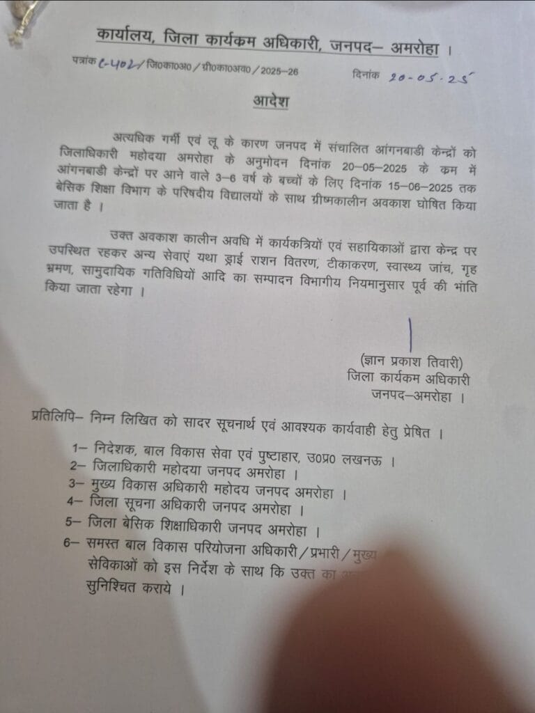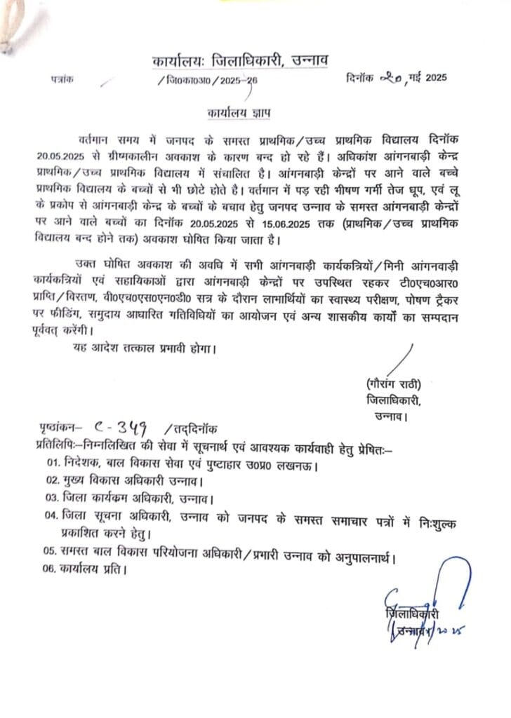 जिलाधिकारी उन्नाव Gauranag Rathi और जिला कार्यक्रम अधिकारी अमरोहा Gyan Prakash Tiwari ने अपने कार्यकाल ज्ञाप 20 मई 2025 को पत्र जारी कर आंगनवाड़ी केंद्रों में अवकाश घोषित होने की सूचना जारी की है |