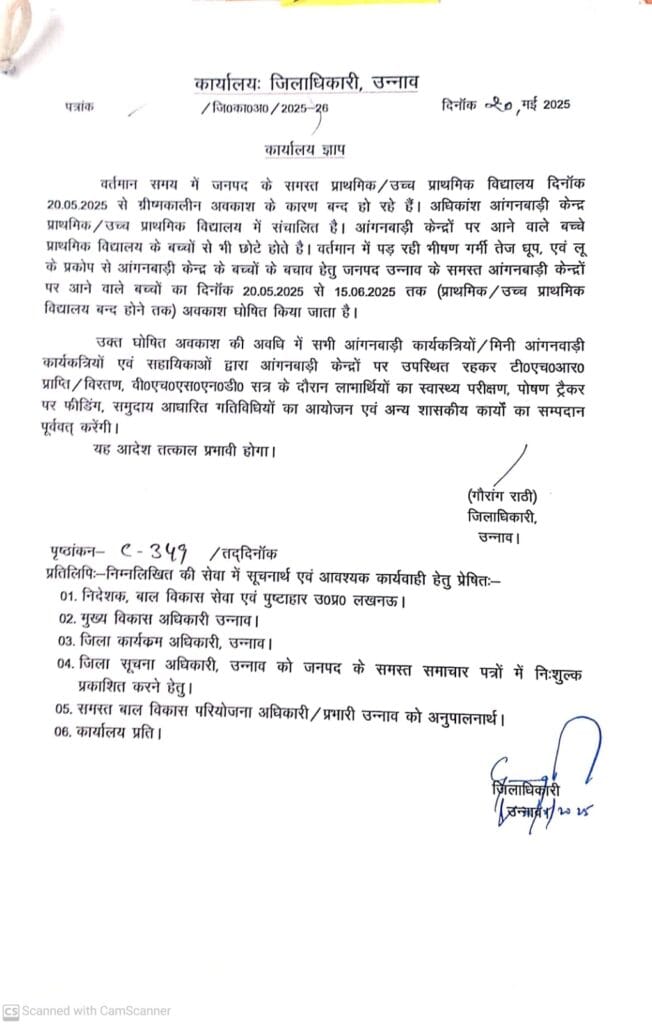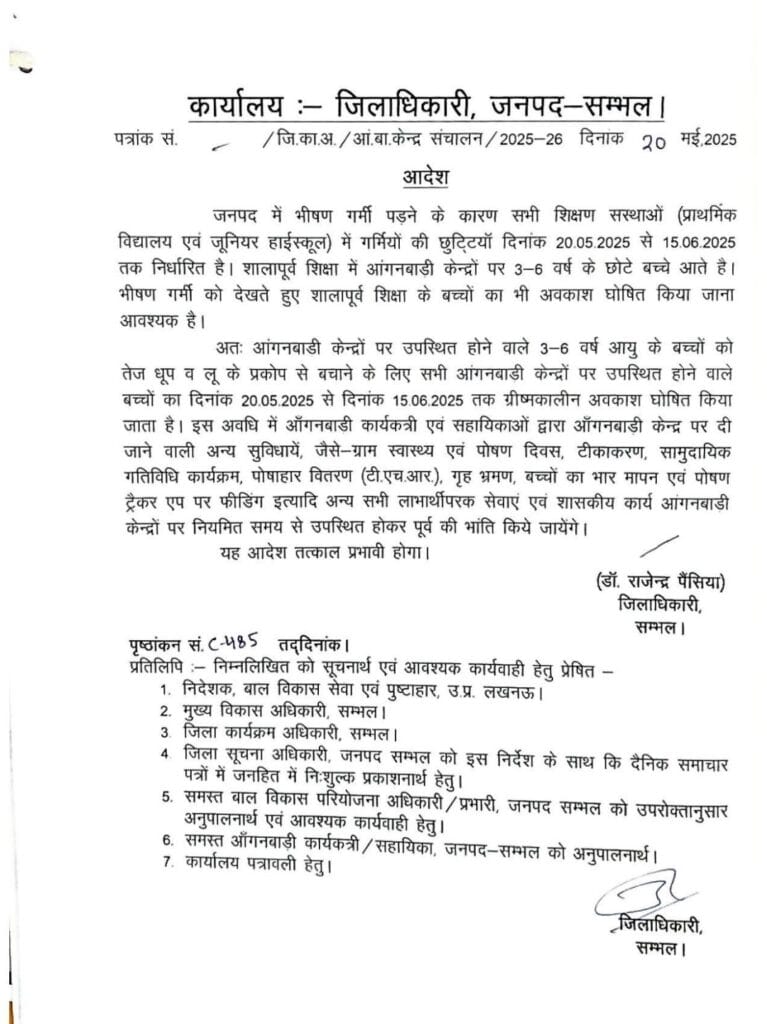 आंगनवाड़ी में ग्रीष्मकालीन अवकाश का आदेश जारी