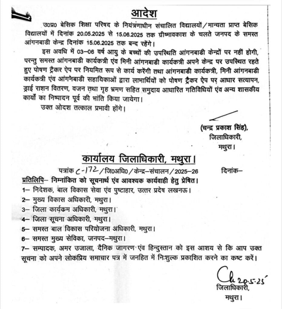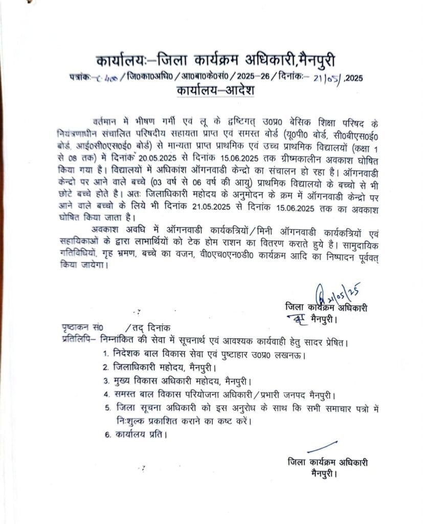 मैनपुरी मथुरा उन्नाव सम्भल अमरोहा आदि जनपदों में आंगनवाड़ी केंद्रों पर ग्रीष्मकालीन अवकाश के आदेश जारी हो चुके हैं शीघ्र अन्य जिलों में जारी होंगे |